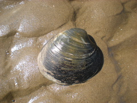 A large black bivalve, with obvious concentric growth lines across the shell. When washed ahore, the papery shell covering is often sloughed off by sand and reveals a brownish-white shell beneath. They are identifiable predominantly by their large size (up to 13cm).