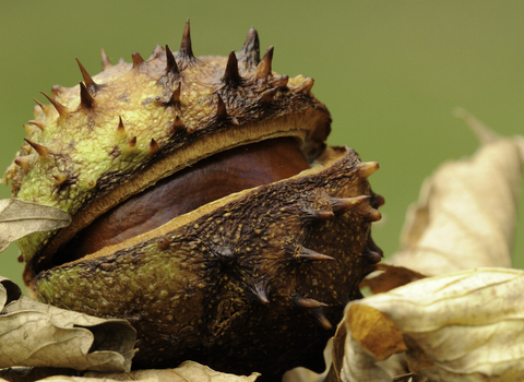 A tall, broad tree of woodlands, roadsides and parks, the introduced horse chestnut is familiar to many of us the 'conker' producing tree - its shiny, brown seeds appearing in their spiny cases in autumn.