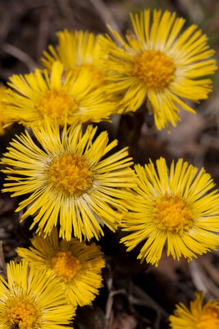 Bright yellow Colt’s‑foot flowers in bloom, with several round, daisy‑like flower heads made of fine, narrow petals clustered closely togethe